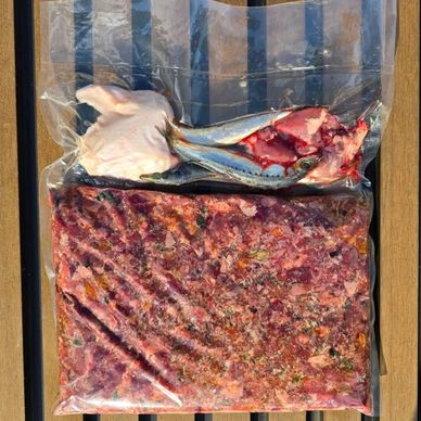 ~70% muscle meat • 10% bone • 10% organ • 10% vegetables & fruits